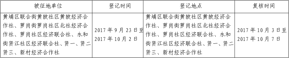 经省人民政府批准(粤国土资(建)字〔2017〕474号文),需将广州市黄埔区联合街黄陂社区黄陂经济合作社、萝岗街萝岗社区北社经济合作社、萝岗社区经济联合社、永和街贤江社区经济联合社、贤一、贤二、贤三、新村经济合作社共10.8210公顷(合162.315亩)集体土地征收为国有土地。现将经依法批准的《征收土地方案》和市人民政府批准的《征地补偿安置方案》内容和有关事项公告如下: