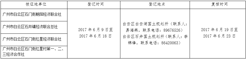经广州市人民政府同意并经广东省人民政府批准(粤国土资(建)字〔2017〕223号)同意将白云区石门街红星村、朝阳村和石井镇经济联合社属下的集体土地征收为国有土地。现将经依法批准的《征收土地方案》、市人民政府批准的《征地补偿安置方案》内容和有关事项公告如下: