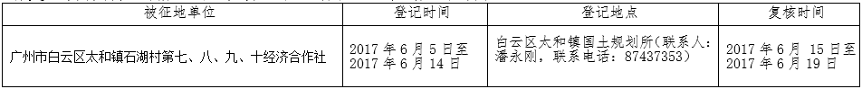 经广州市人民政府同意并经广东省人民政府批准(粤国土资(建)字〔2017〕239号)同意将白云区太和镇石湖村地段5.5541公顷集体土地征收为国有土地。现将经依法批准的《征收土地方案》、市人民政府批准的《征地补偿安置方案》内容和有关事项公告如下: