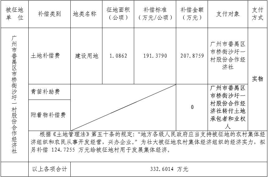 三、被征地村及面积:广州市番禺区市桥街沙圩一村股份合作经济社,集体土地1.0862公顷(折合约16.2930亩),全部建设用地。