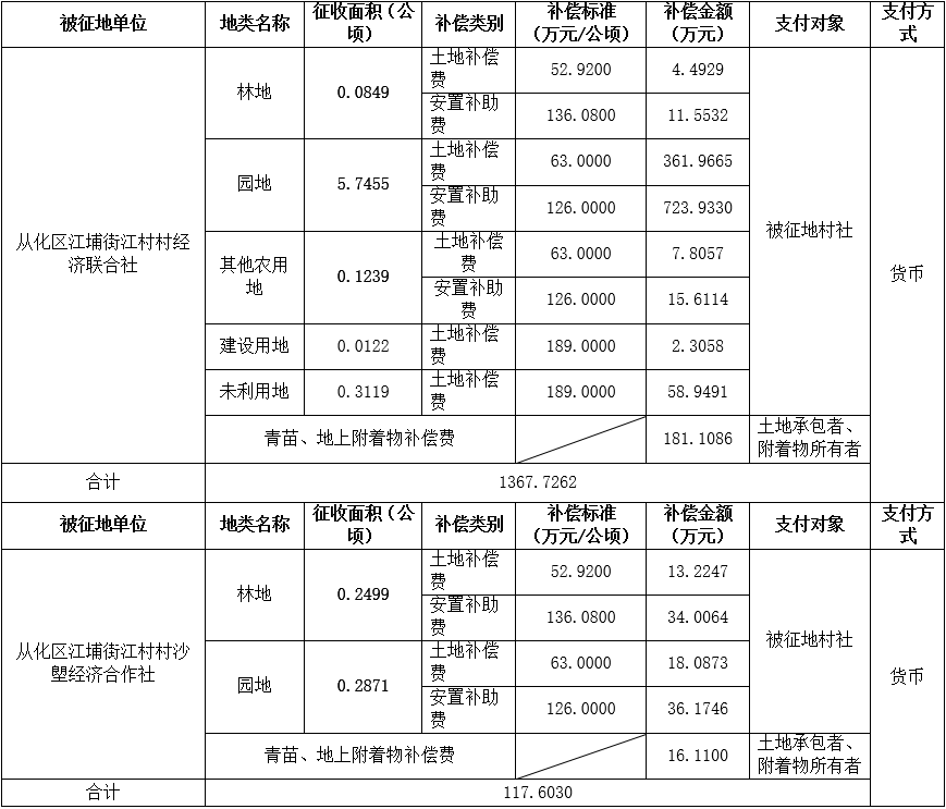 (二)本次征收土地所涉及的被安置农业人员由广州市从化区江埔街江村经济联合社、江村沙塱经济合作社以货币补偿等形式安置。