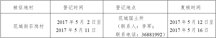 经省人民政府批准(粤国土资(建)字〔2016〕281号文),需将广州市花都区石岗村属下的集体土地5.8382公顷(合87.57亩)征收为国有土地。现将经依法批准的《征收土地方案》和市人民政府批准的《征地补偿安置方案》内容和有关事项公告如下: