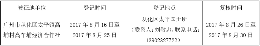 经广州市人民政府同意并经广东省人民政府批准(粤国土资(建)字〔2015〕1462号)同意将广州市从化区太平镇高埔村地段9.4040公顷集体土地征收为国有土地。现将经依法批准的《征收土地方案》、市人民政府批准的《征地补偿安置方案》内容和有关事项公告如下: