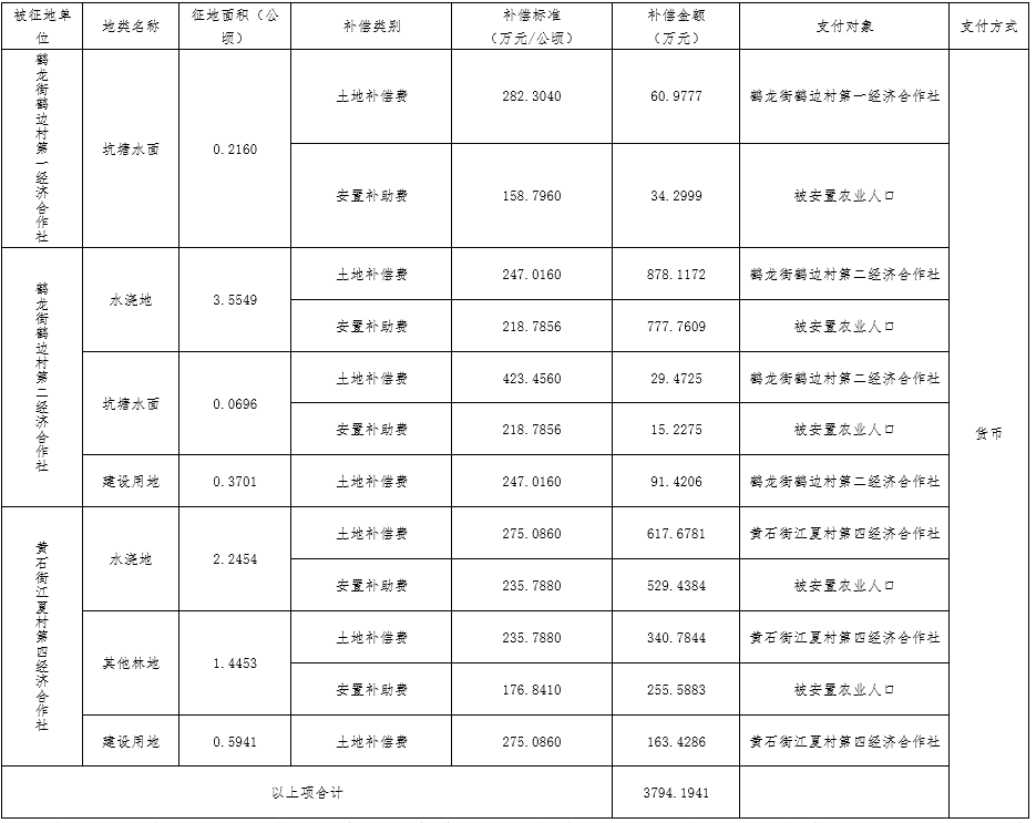 青苗补偿费标准按区政府的有关规定执行,具体金额如下:青苗补偿费共76.1763万元,其中,3.24万元由鹤龙街鹤边村第一经济合作社转付土地承包者,54.3675万元由鹤龙街鹤边村第二经济合作社转付土地承包者,18.5688万元由黄石街江夏村第四经济合作社转付土转付土地承包者;地上附着物补偿费5.335万元,其中,2.6616万元由鹤龙街鹤边村第二经济合作社转付土地承包者转付地上附着物所有者,2.6734万元由黄石街江夏村第四经济合作社转付地上附着物所有者。
