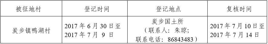 经省人民政府批准(粤国土资(建)字〔2017〕228号文),需将广州市花都区炭步镇鸭湖村属下的集体土地4.8063公顷(合72.0945亩)征收为国有土地。现将经依法批准的《征收土地方案》和市人民政府批准的《征地补偿安置方案》内容和有关事项公告如下: