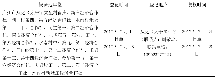 经广州市人民政府同意并经广东省人民政府批准(粤国土资(建)字〔2016〕684号)同意将广州市从化区太平镇共星村、湖田村、水南村地段6.1364公顷集体土地征收为国有土地。现将经依法批准的《征收土地方案》、市人民政府批准的《征地补偿安置方案》内容和有关事项公告如下: