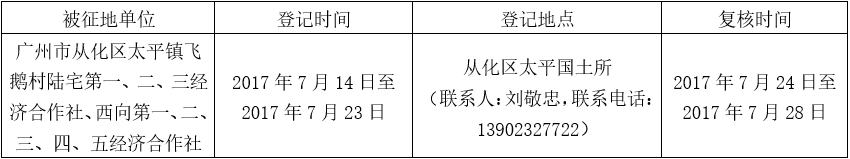 经广州市人民政府同意并经广东省人民政府批准(粤国土资(建)字〔2016〕684号)同意将广州市从化区太平镇飞鹅村地段13.0445公顷集体土地征收为国有土地。现将经依法批准的《征收土地方案》、市人民政府批准的《征地补偿安置方案》内容和有关事项公告如下: