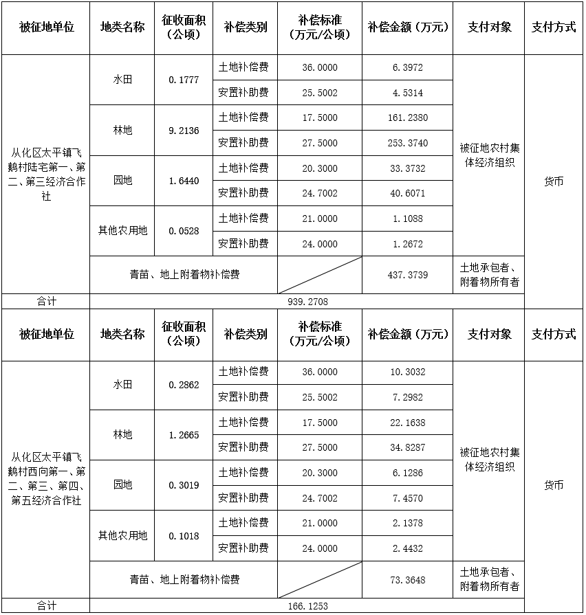 (二)本次征收土地所涉及的被安置农业人员由广州市从化区太平镇飞鹅村陆宅第一、二、三经济合作社、西向第一、二、三、四、五经济合作社以货币补偿等形式安置。