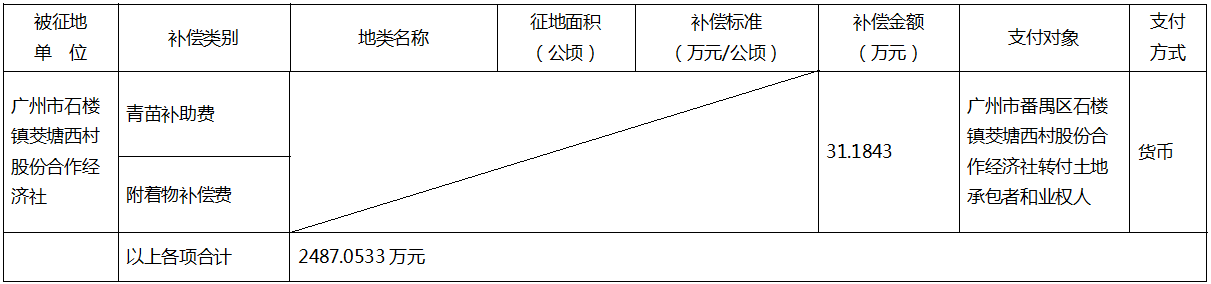 (二)本次征收土地所涉及的被安置农业人员由广州市番禺区石楼镇胜洲村股份合作经济社和广州市番禺区石楼镇茭塘西村股份合作经济社以货币补偿的形式安置。请广州市番禺区石楼镇胜洲村股份合作经济社和广州市番禺区石楼镇茭塘西村股份合作经济社在本公告期内到广州市番禺区国土资源和规划局领取办理安置农业人口征地农转非手续的函件。
