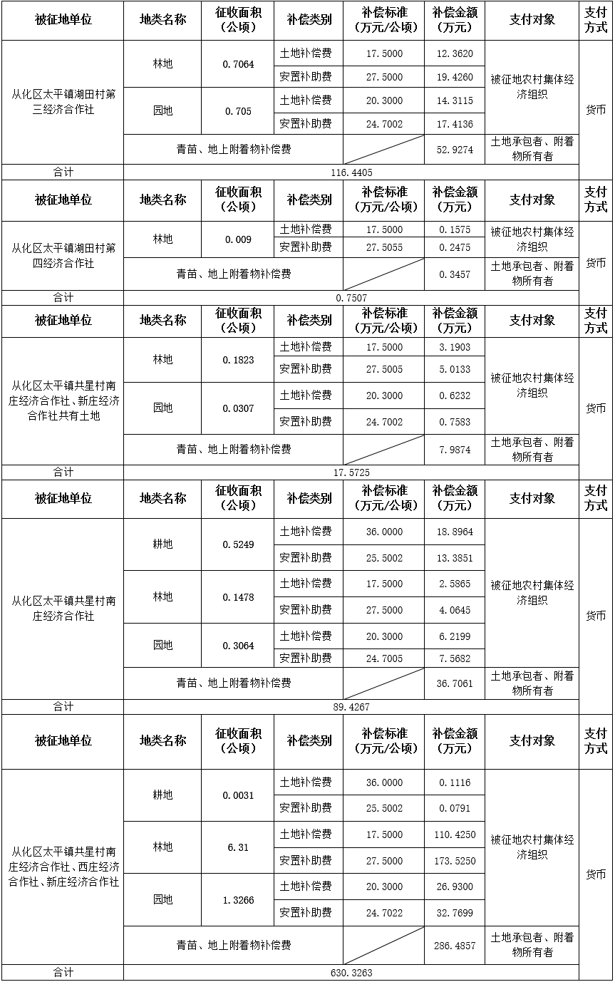 (二)本次征收土地所涉及的被安置农业人员由广州市从化区太平镇湖田村第三、第四经济合作社,共星村南庄、新庄、西庄经济合作社以货币补偿等形式安置。