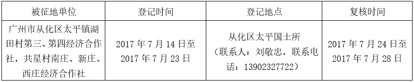 经广州市人民政府同意并经广东省人民政府批准(粤国土资(建)字〔2016〕684号)同意将广州市从化区太平镇湖田村、共星村地段10.2522公顷集体土地征收为国有土地。现将经依法批准的《征收土地方案》、市人民政府批准的《征地补偿安置方案》内容和有关事项公告如下: