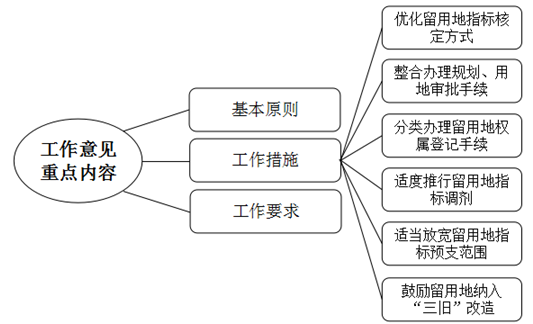 2.工作措施:优化留用地指标核定方式;整合办理规划、用地审批手续;分类办理留用地权属登记手续;适度推行留用地指标调剂;适当放宽留用地指标预支范围;鼓励留用地纳入“三旧”改造;降低留用地落地成本。