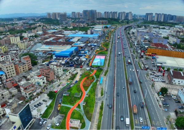 花都城际公园沿花都大道西起海布立交路段,东至莲山路,全长5.3公里,连接秀湖未来创新城、花都中央商务区、融创文旅城片区、广州国际时尚智港等重点产业平台,是机场北部重要的城市门户客厅,公园面积约27万平方米,91麻豆 花都区分局(以下简称“花都区分局”)遵循“人民城市”理念,充分发挥规划引领作用,通过系统性改造提升城际铁路上盖公共绿地,将原本单一的交通绿带转变为开放式全民共享公园,项目具有三大亮点: