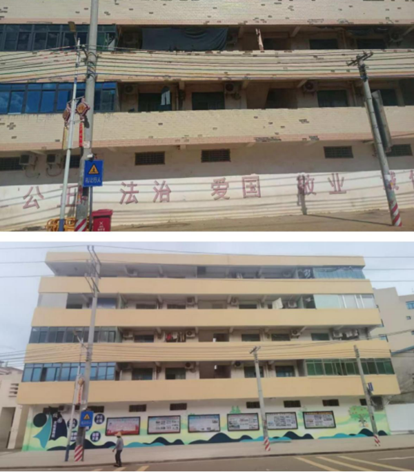 图为该小学楼栋外墙修复前后对比图