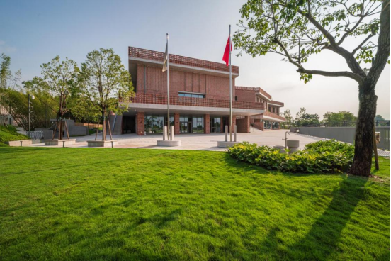 当站在塱头“耕学+”研学中心的屋顶上,会感受到一种奇妙的空间律动——草坪宛如绿色画布,与河流相互交织,从红砖建筑脚下一路铺展至远方。