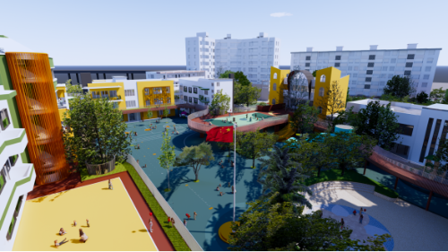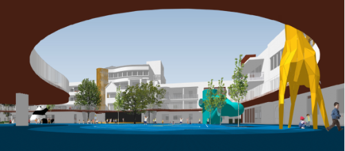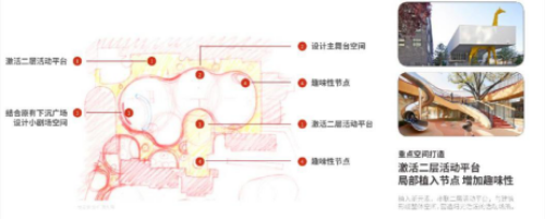 入口改造提升激活节点空间。对入口形象进行提升改造,同时激活二层活动平台,增加趣味性节点,与建筑形成整体空间,营造阳光活泼儿童喜爱的活动场所。