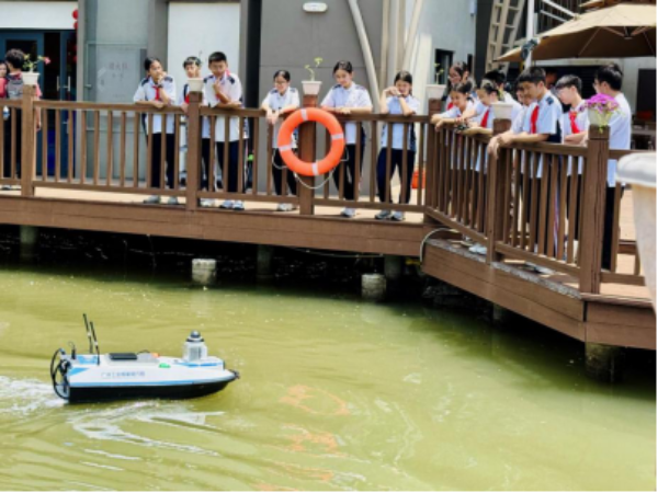 广州工业智能研究院工程师现场操控搭载多种水质在线监测传感器的智能无人船,上演“水上机器人总动员”——在自主巡航中完成水质实时检测;工作人员还演示了智能无人船自动泊位的功能,在场同学纷纷对科技在生态保护中所展现出的强大力量发出惊叹。