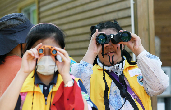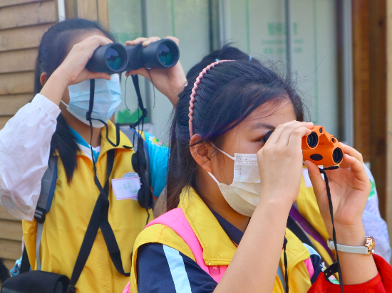 穿过一条幽径,走过一座石桥,小记者们来到了本次活动观鸟的地点。在这里,讲解员“肥牛”老师用幽默风趣的语言向大家传授了观鸟的技巧和望远镜的使用方法。小记者们跃跃欲试,争先恐后地走上前去用单筒望远镜观鸟。