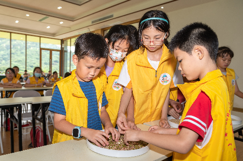 走出室内的文化馆,穿过“希望之翼”,步入“时光之门”,万顷的稻浪涌起绿波,笔直的木栈道通向远方。小记者们跟随着讲解员的脚步,深入稻田中,亲身体验插秧等农业活动。他们鼓足勇气,脱下鞋袜、挽起裤腿,一个接着一个踏入稻田中央,在工作人员的指导下,将秧苗整整齐齐地插入了水田之中。穿行于田间的孩子,就像他们刚刚插下的秧苗一般,生机郁郁。小记者骆晓萱认为,这是一次难得的户外活动:“平时,爸爸妈妈只是周末带我去爬山,这是我第一次体验插秧。”看着孩子被汗水打湿的脸庞,小记者伍荣轩的母亲也表示:“平时在城市里,没有机会带孩子来体验农活,我觉得这样的活动很有意义。”