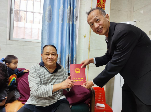 此次送证上门服务的对象是香凝苑项目的一位业主。因身体行动不便,吴先生无法亲自前往登记中心办理手续。荔湾区不动产登记中心在了解到这一情况后,主动上门服务,最终将证书直接送至业主家中,业主多年心事终于得以解决。这一暖心举措彰显了政府服务“最后一公里”的人文关怀,荔湾区不动产登记中心正以实际行动诠释“民有所呼,我有所应”的理念,为群众提供有温度的不动产登记服务。