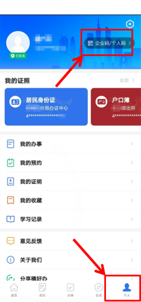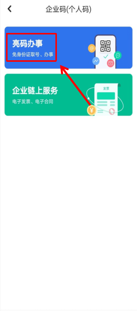 第二步:申请人在底部导航栏目点击“个人”,进入右上角“企业码/个人码”,点击“亮码办事”。