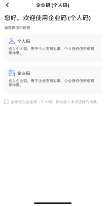 第三步:申请人根据办理事项,选择使用场景“个人码”或“企业码”,“刷脸”进行身份认证后,向不动产登记机构展示“个人码/企业码”。(注:使用企业码功能,首先办事人需通过“微警认证”进行实人刷脸,再使用企业账户通过“粤信签”小程序进行企业法人身份验证,认证成功后才进行亮码操作。)