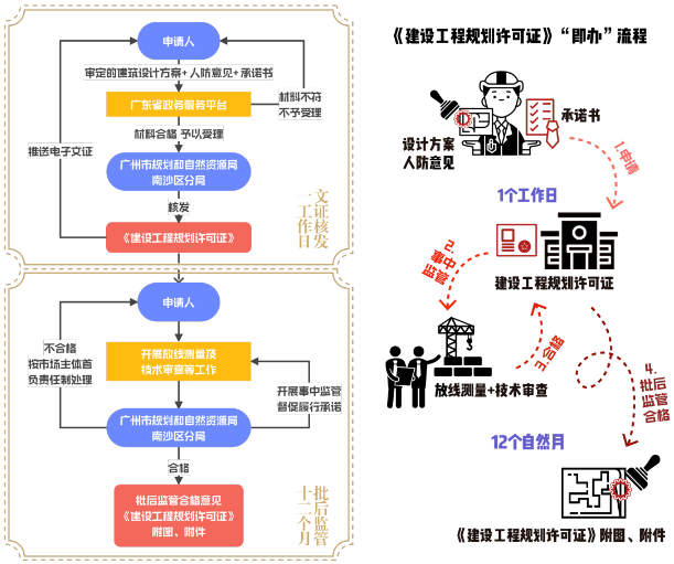 目前,新建建筑工程《建设工程规划许可证》(告知承诺制信用审批即刻办理)业务已在广东省政务服务网上线,针对广州市南沙新区范围内已完成建筑工程设计方案审查并取得人民防空主管部门审核意见的新建建筑工程,均可以告知承诺的形式申请办理,南沙区分局将在受理后1个工作日办结,生成的电子证照和电子文证直接通过网上送达申请人。