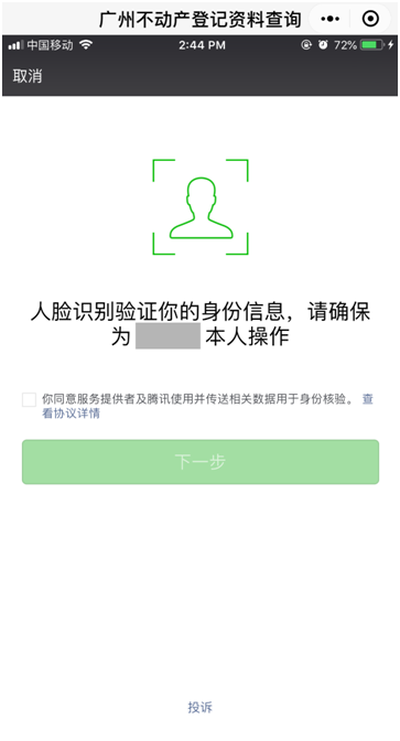 The applicant acknowledgesand agreesthat the service provider and Tencent may use and send the relevant data for identity authentication. Click "Next" to complete the identity authentication through face recognition. Please face the screen of your mobile phone, and wait for the scanning to complete. Hold your position and your mobile phone still, and read the number displayed aloud inMandarin, as shown below: