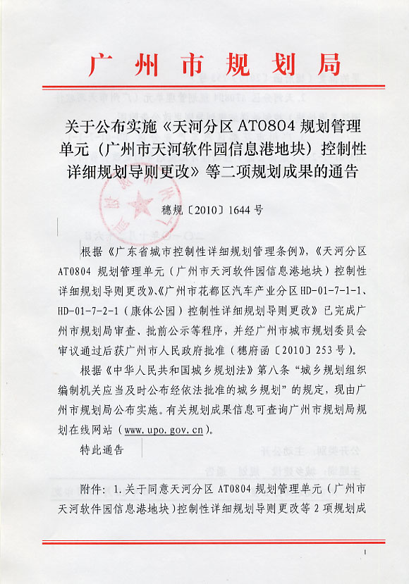 天河分区AT0804规划管理单元(广州市天河软件园信息港地块)控制性详细规划导则更改