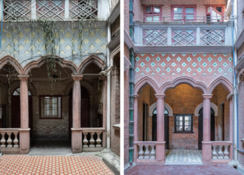 尽可能恢复柏园的历史风貌,展示建筑的“真实性”,是柏园保护修缮工作的首要原则和重中之重。拆除阁楼、搬移壁橱、撕掉墙纸后,被现代建筑材料所遮蔽的历史构件和装饰得以重现。每一块花阶砖、每一扇拱券门,都在讲述着过往的故事。