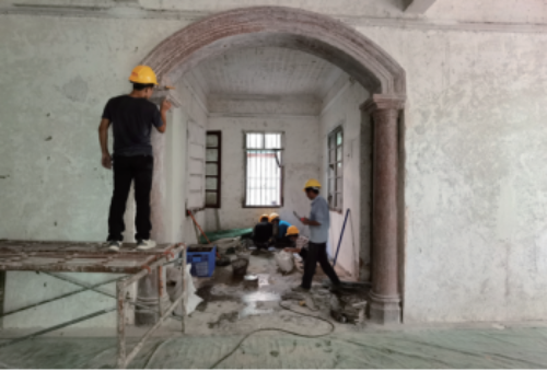清理水磨石拱券上覆盖的墙漆,修补花阶砖地面
