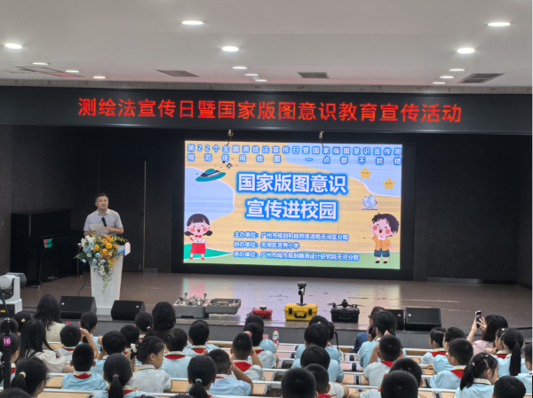 本次活动由天河区分局主办,天河区灵秀小学协办,广州市城市规划勘测设计研究院有限公司天河分院承办,共计约220名师生参加。活动围绕“规范使用地图 一点都不能错”的主题开展,工程师们用生动有趣的PPT课件和浅显易懂的语言为灵秀小学的同学们讲解国家版图和测绘法知识,并现场展示测绘仪器的使用。同学们认真听讲,踊跃举手回答问题,部分学生代表上台近距离观察无人机、机器狗等测绘仪器设备,感受测绘技术的发展与魅力。活动现场,天河区分局有关负责同志鼓励师生们要熟悉国家版图,正确使用地图,自觉保护国家利益和民族利益。在轻松愉悦的氛围中,同学们既学到了测绘和地图的知识,也深刻认识到国家版图的重要意义。
