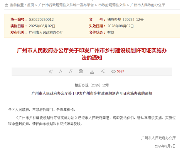 2025年8月2日,《广州市乡村建设规划许可证实施办法》(穗府办规〔2025〕12号)正式印发实施,为全市乡村建设规划管理提供了清晰的制度依据和操作指引。该办法聚焦于全市七区村庄规划确定的集体建设用地范围内的村民住宅建设,明确坚持“先规划、后许可、再建设”的原则,倡导节约集约用地、严守耕地保护红线,并进一步优化审批流程,提升政务服务的便民性和透明度。