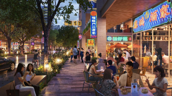 交通设计上,引入香港小窄密路系统,构建功能与文化交融的特色街道网络。“嘉学路”通过窄退线、弹性车道设计,串联香港科技大学(广州)与庆盛枢纽,营造紧凑活力的创业界面;“创智路”融合岭南骑楼与香港五彩招牌,连接生活区与地铁站,还原粤港两地共有的街道生活场景。两条街道在大学广场交汇,与香港科技大学(广州)正门形成视觉呼应,推动校区、园区、社区“三区”无界融合,让港籍师生与居民便捷享受街道交流空间。