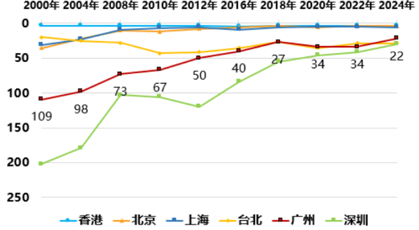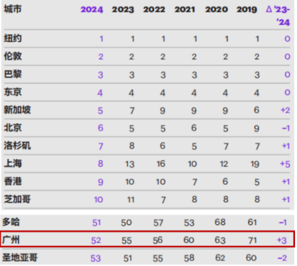 2024年广州在科尔尼(Kearney)《全球城市报告》的全球城市综合排名中位列第52位,相较于2019年上升19位,与费城、奥斯陆、吉隆坡等城市处于同一水平,领先深圳(第68位)。