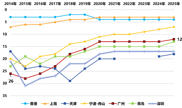 2025年广州在新华·波罗的海国际航运中心发展指数中排名超越东京位居全球第12位,自2014年指数发布以来排名呈现上升趋势,世界排名上升了14位,国内排名从全国第7上升至全国第4,先后超越深圳、天津、青岛。