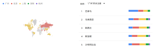 从关注来源地来看,2024年全球最关注广州的国家依次为巴拿马、马来西亚、新西兰、新加坡、沙特阿拉伯,其中巴拿马对广州的关注度超过其他几个国内主要城市;国内最关注广州的城市依次为深圳、北京、上海三大一线城市。