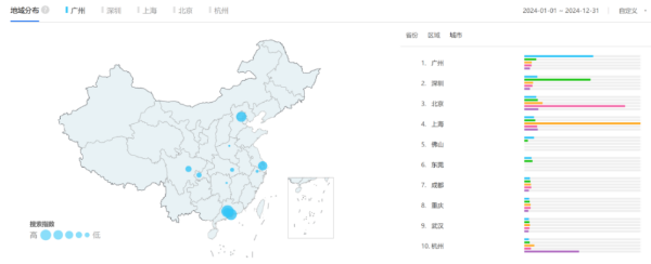 根据谷歌搜索指数和百度搜索指数,2024年广州国外关注度与杭州相当,仅次于北京、上海、深圳;国内关注度高于深圳、杭州等城市,仅次于上海、北京。