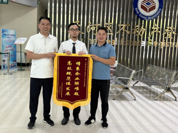 近日,广州市天河区不动产登记中心(以下简称“天河登记中心”)企业专窗收到一面来自企业赠送的锦旗。“情系企业解难题,高效规范促发展”,企业对天河登记中心工作人员在办理复杂批量案件中展现出的专业、高效和贴心服务表示高度认可和衷心感谢。