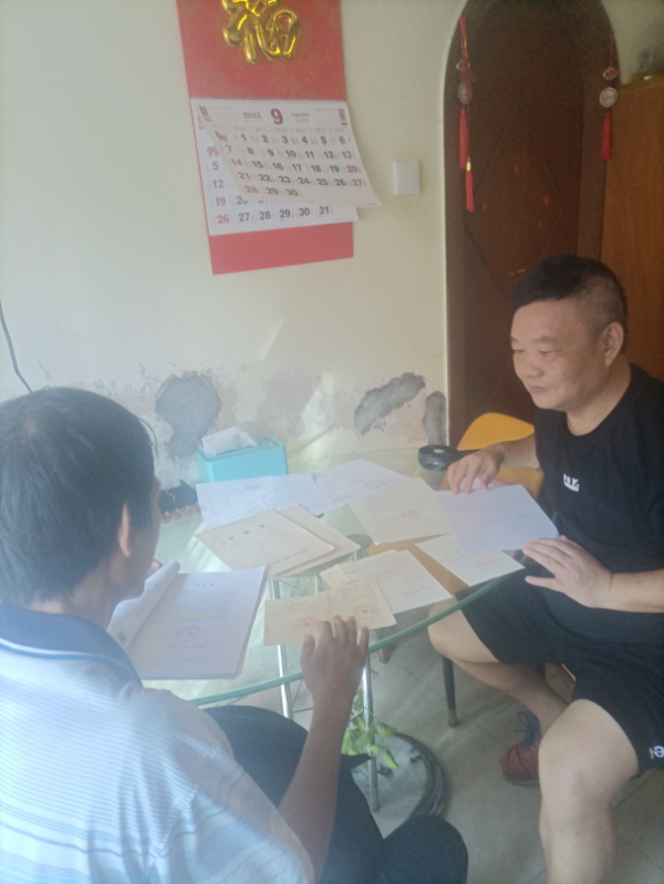 工作人员上门协助刘先生准备申请材料