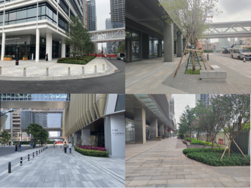 琶洲西区地块开发时,鼓励红线内外场地进行一体化设计与施工,景观绿化、广场与慢行道铺装、城市家具以及市政设施的风格、色调和材质应协调统一。并从人的出行体验出发,灵活布置场地的高程设计,退缩带、绿化带、骑行带、步行带、设施带应零高差联通,严格控制设置台阶,确保骑行、步行与设施带之间的平顺过渡,无高差联通,形成无障碍的、安全平顺的场地环境。