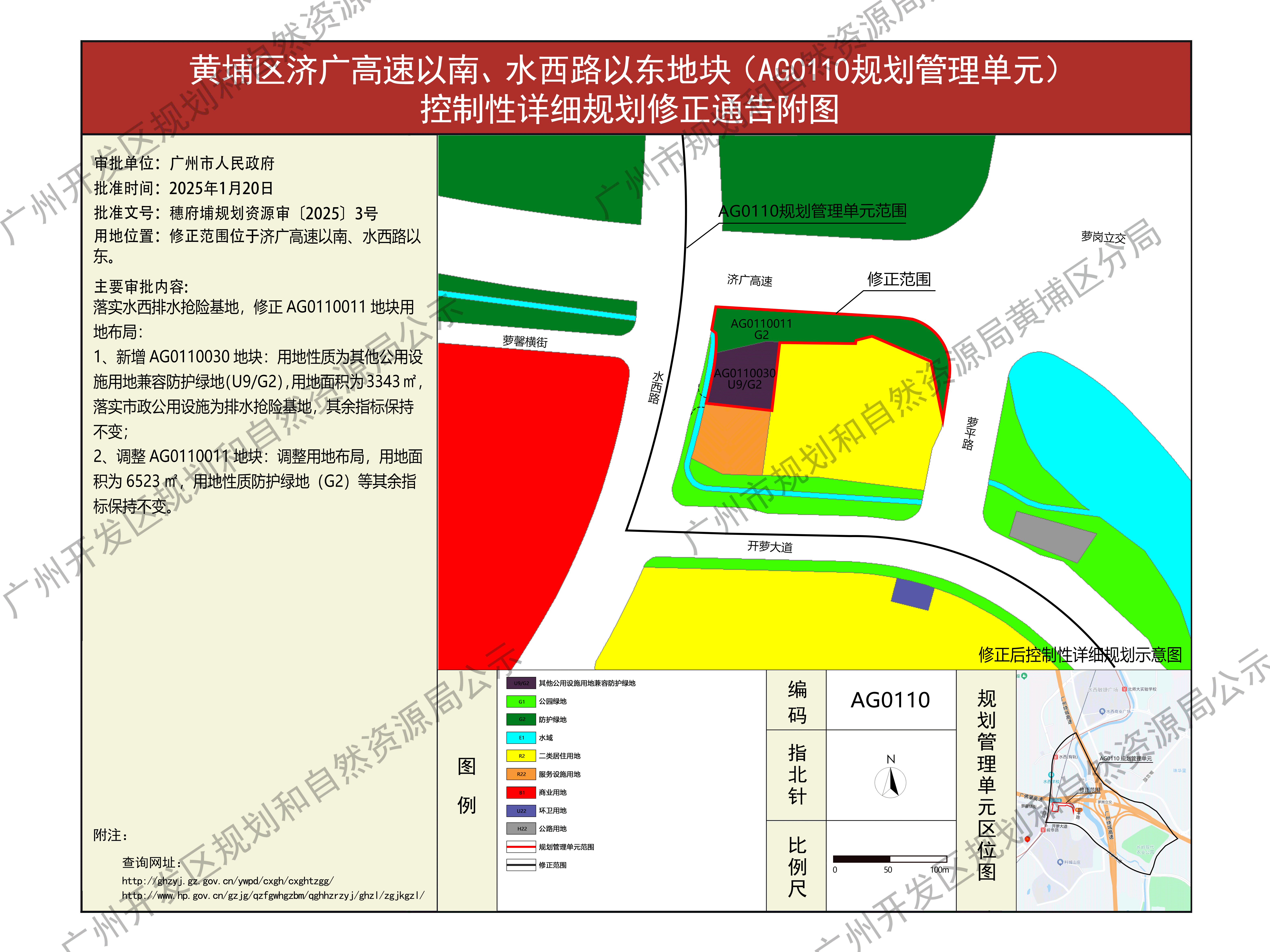 根据《广东省城市控制性详细规划管理条例》要求,《黄埔区济广高速以南、水西路以东地块(AG0110规划管理单元)控制性详细规划修正》已完成规划技术审查、批前公示等程序,并经广州市人民政府批准(穗府埔规划资源审〔2025〕3号),自批准之日(2025年1月20日)起生效。