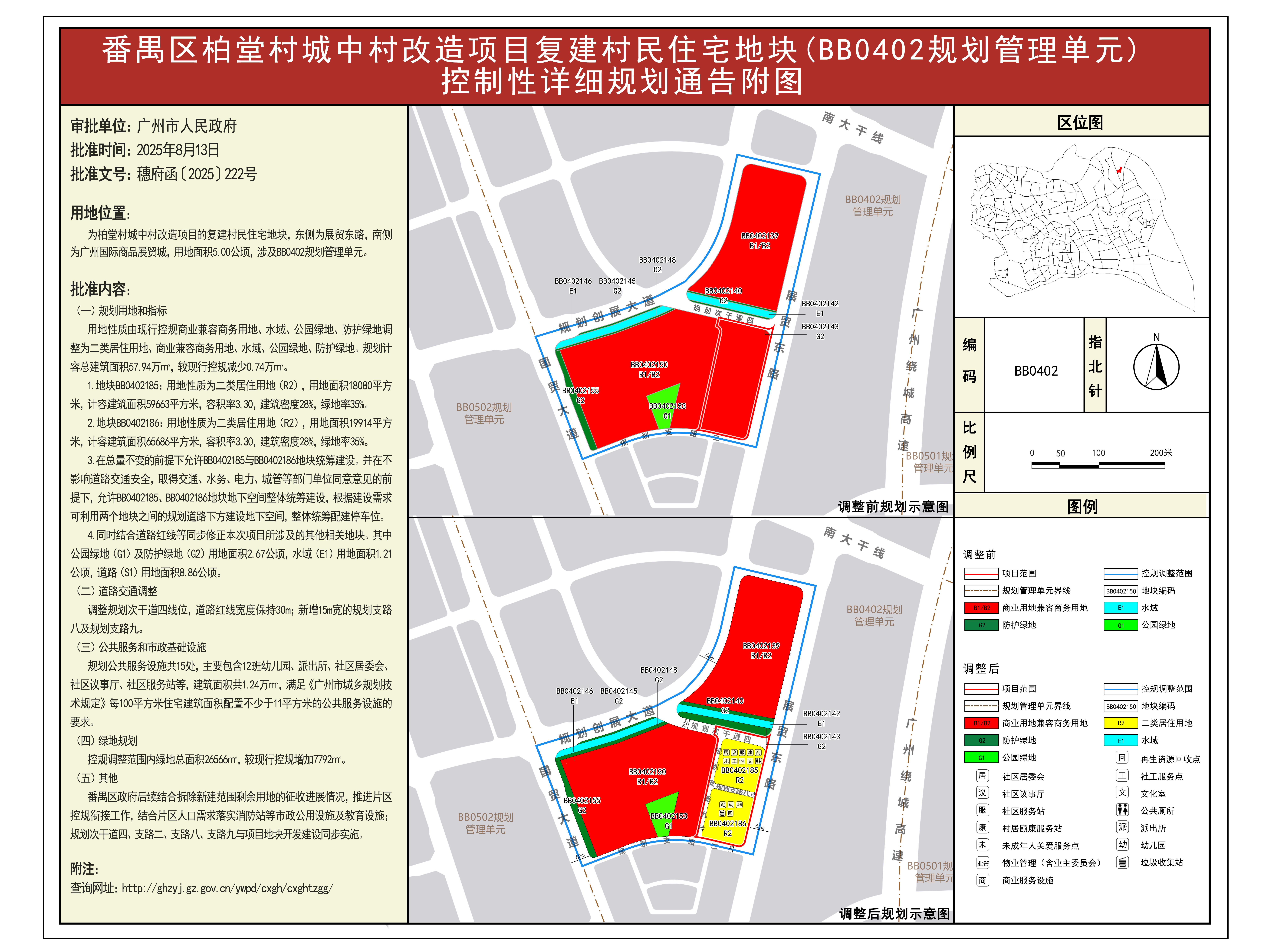 根据《广东省城市控制性详细规划管理条例》,《番禺区大石街道南大干线北侧储备地块(BA0602规划管理单元)控制性详细规划》《番禺区大富村城市更新单元详细规划(BC0407、BC0408规划管理单元)》《番禺区柏堂村城中村改造项目复建村民住宅地块(BB0402规划管理单元)控制性详细规划》《白云区夏茅片区城市更新单元控制性详细规划》《珠江新城N3-5、N3-6地块(AT1114规划管理单元)控制性详细规划局部调整》《天河区小新塘南片区AT1003023地块建筑高度优化》6项规划成果已完成编制、审查、公示等程序,由广州市规划委员会审议通过后经广州市人民政府批准(穗府函〔2025〕222号),自批准之日(2025年8月13日)起生效。