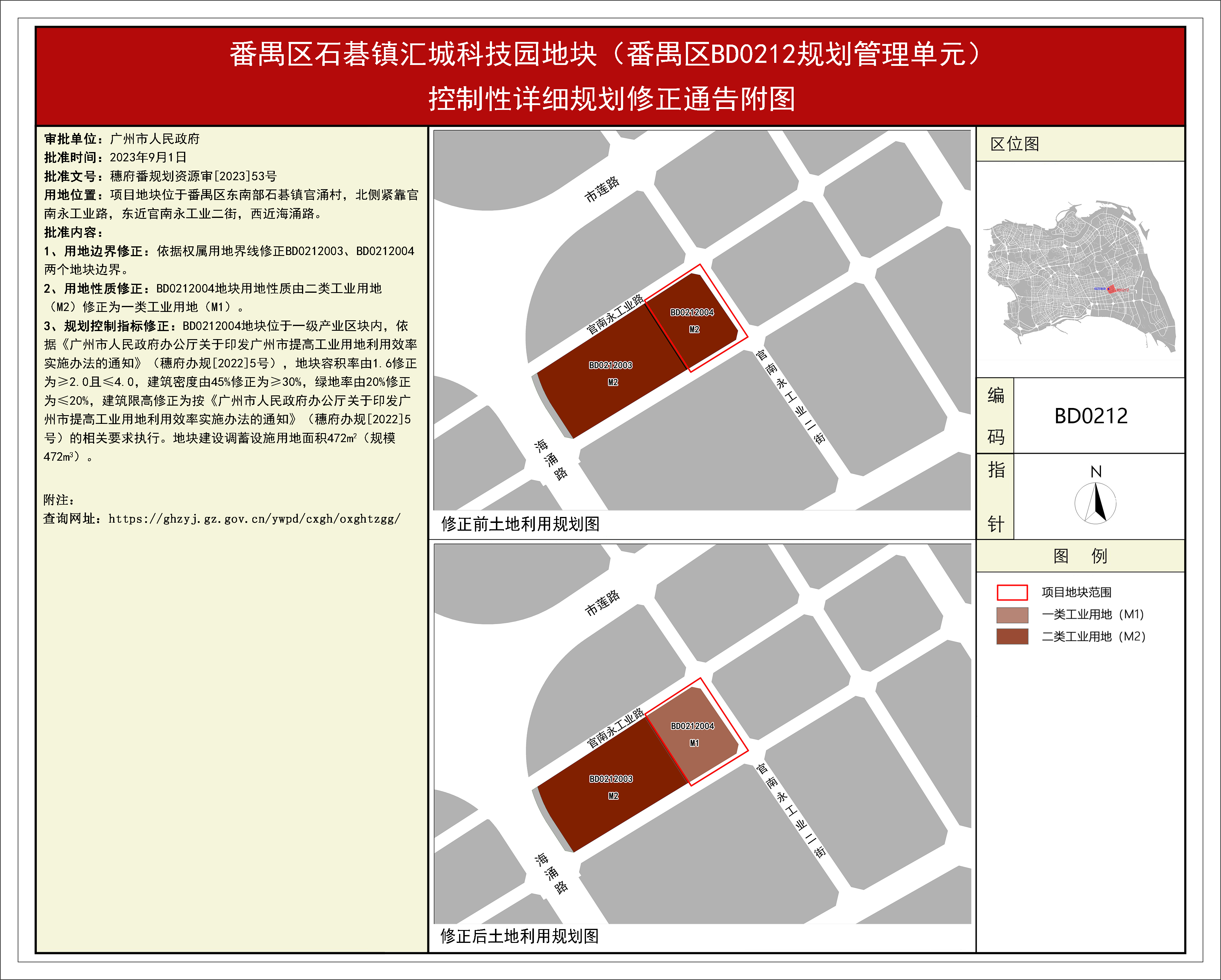 根据《广东省城市控制性详细规划管理条例》、《广州市人民政府关于将一批市级行政职权事项继续委托区实施的决定》(穗府[2019]8号)、《广州市人民政府关于收回一批市级行政权力事项的决定》(广州市人民政府令第188号),《番禺区石碁镇汇城科技园地块(番禺区BD0212规划管理单元)控制性详细规划修正》规划成果已完成规划技术审查、批前公示等程序,并经番禺区土地和规划领导小组会议审议通过后获广州市人民政府批准,自批准之日(2023年9月1日)起生效。