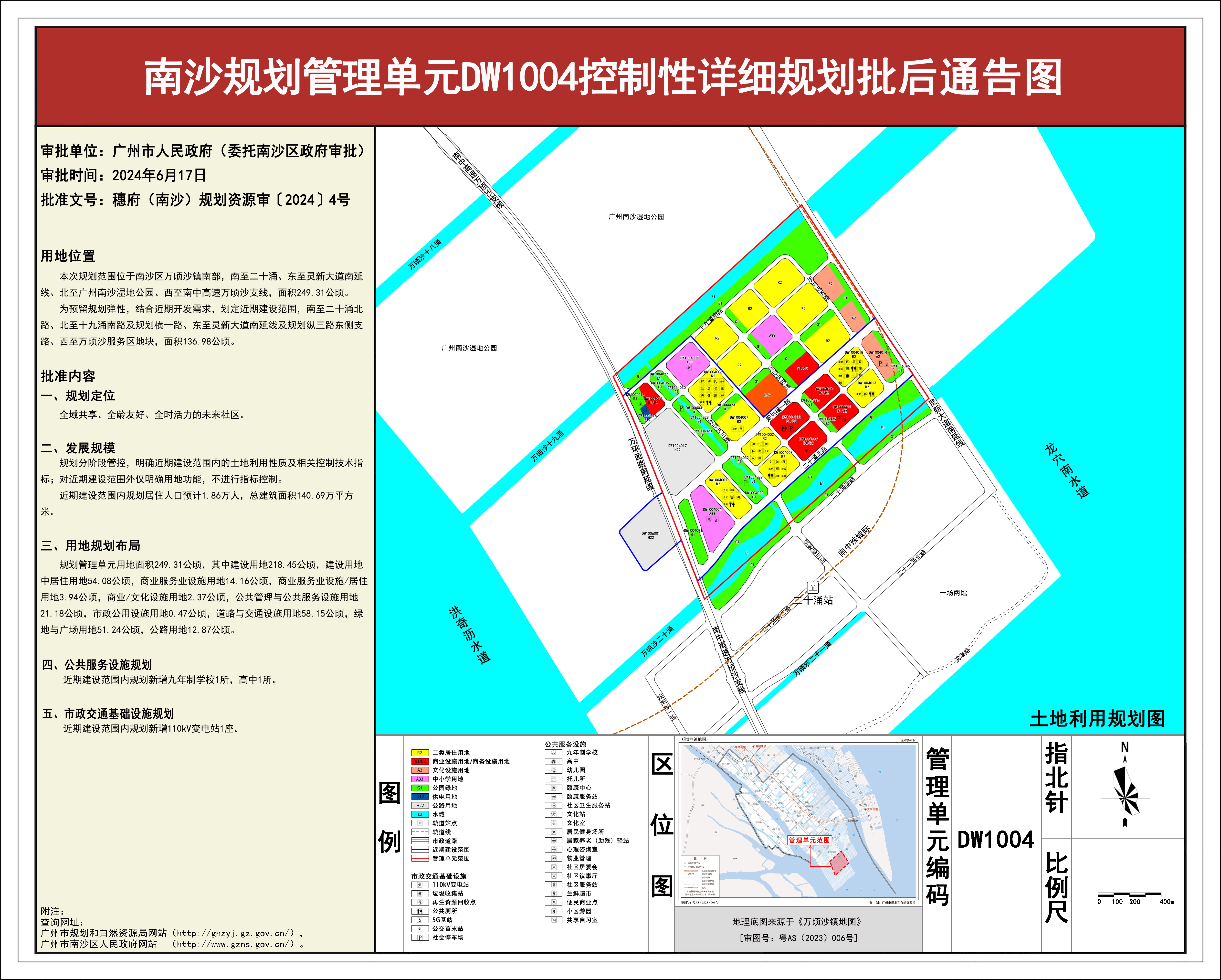 根据《广东省城市控制性详细规划管理条例》《广州市城乡规划程序规定》有关规定,《南沙规划管理单元DW1004控制性详细规划》已完成规划技术审查、批前公示等程序,并经广州市南沙新区自然资源规划与利用委员会审议通过后获广州市南沙区人民政府(受广州市人民政府委托)批准(穗府(南沙)规划资源审〔2024〕4号),自批准之日(2024年6月17日)起生效。