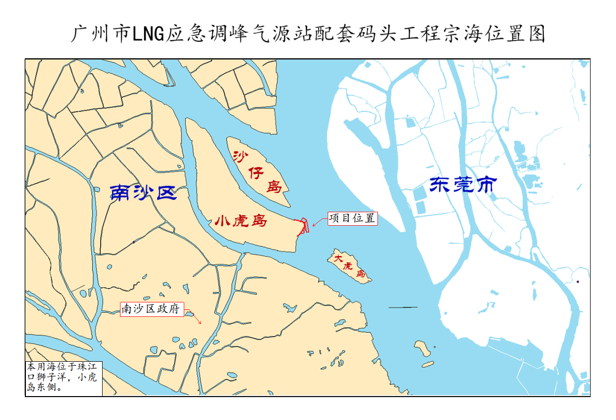 广州市LNG应急调峰气源站配套码头项目用海申请单位为粤海(番禺)石油化工储运开发有限公司,用海位置位于广州市南沙区小虎岛东侧,上游临近鸿业石化码头、下游临近小虎岛成品油储备库码头。该项目用海类型为工业用海,拟申请使用海域面积9.3652公顷,其中非透水构筑物用海1.4379公顷、透水构筑物用海1.0511公顷、取排水口用海3.3059公顷、港池用海面积3.5703公顷。