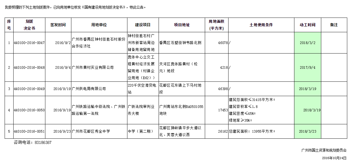 2016年9月广州市国有土地使用权划拨情况公告