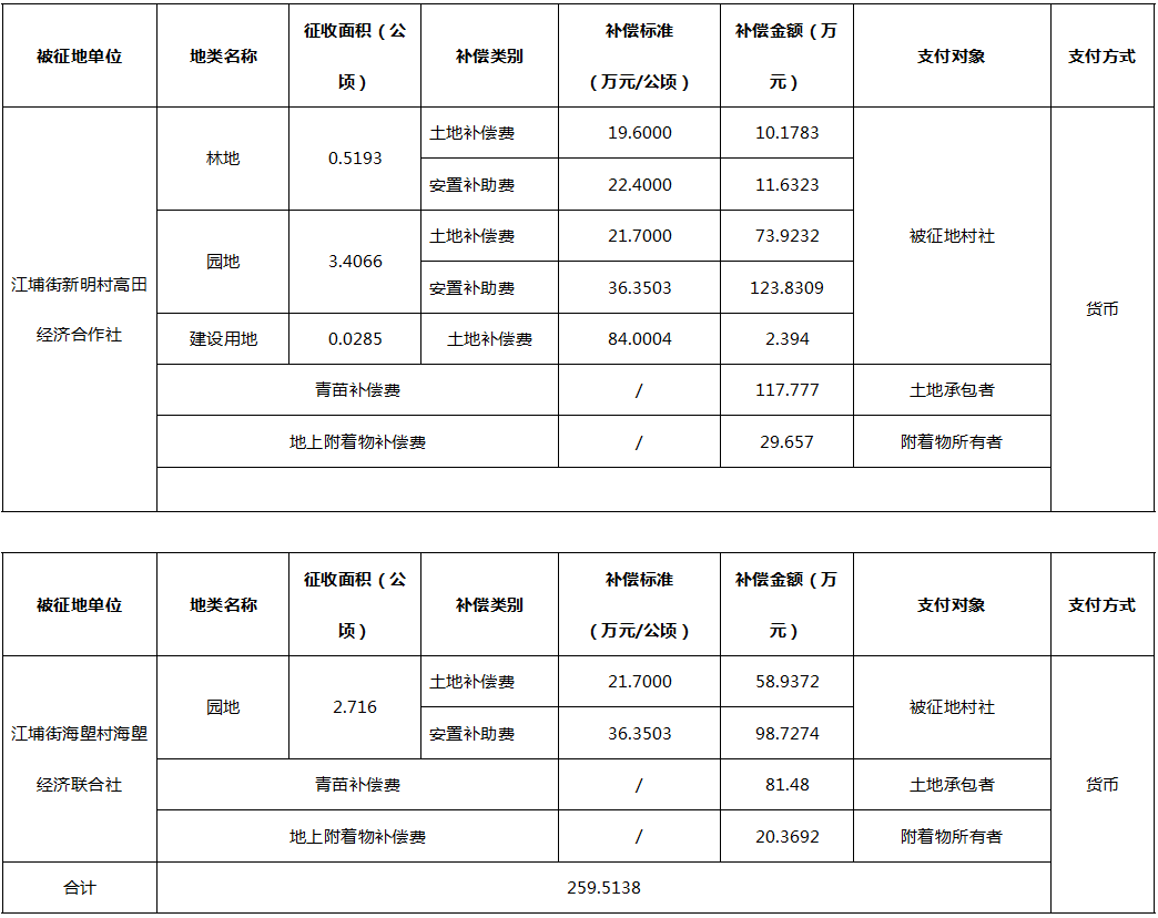 (二)本次征收土地所涉及的被安置农业人员由广州市从化区江埔街新明村高田经济合作社、海塱村海塱经济联合社以货币补偿等形式安置。