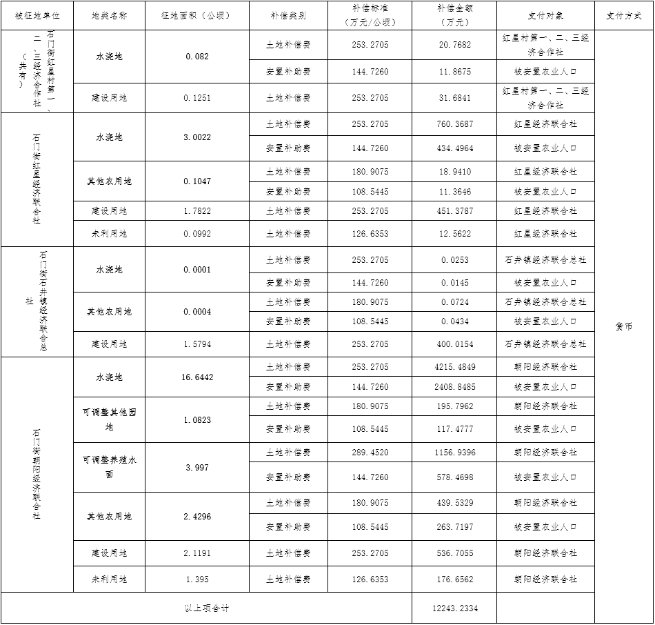 (二)本次征收土地所涉及的被安置农业人员由广州市白云区石门街朝阳经济联合社、广州市白云区石井镇经济联合总社、广州市白云区石门街红星经济联合社、广州市白云区石门街红星村第一、二、三经济合作社以货币补偿的形式安置。请被征地村在本公告期内到广州市白云区国土资源和规划局领取办理安置农业人口征地农转非手续的函件。