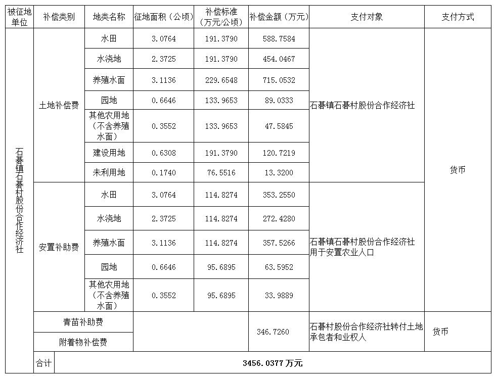 三、被征地村及面积:石碁镇石碁村集体土地10.3871公顷(合155.8065亩),其中耕地5.4489公顷(合81.7335亩),养殖水面3.1136公顷(合46.704亩),园地0.6646公顷(合9.969亩),其他农用地0.3552公顷(合5.328亩),建设用地0.6308公顷(合9.462亩),未利用地0.1740公顷(合2.61亩)。